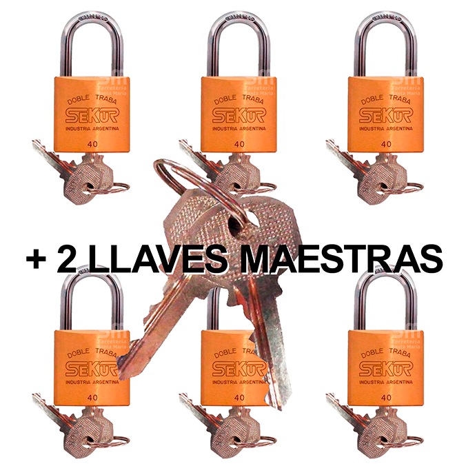 JUEGO DE 6 CANDADOS DE BRONCE DOBLE TRABA A BOLILLAS MARCA SEKUR CON 2 LLAVES MAESTRAS