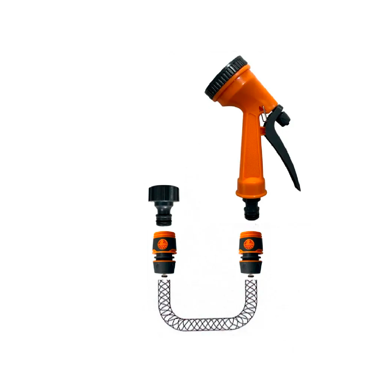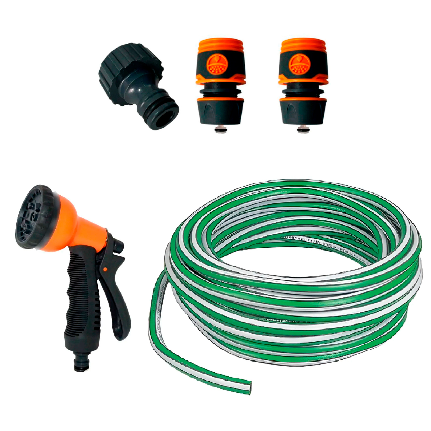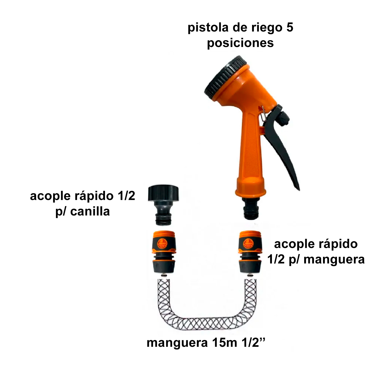 COMBO RIEGO MANGUERA 15M + PISTOLA 5 POS + ACOPLES