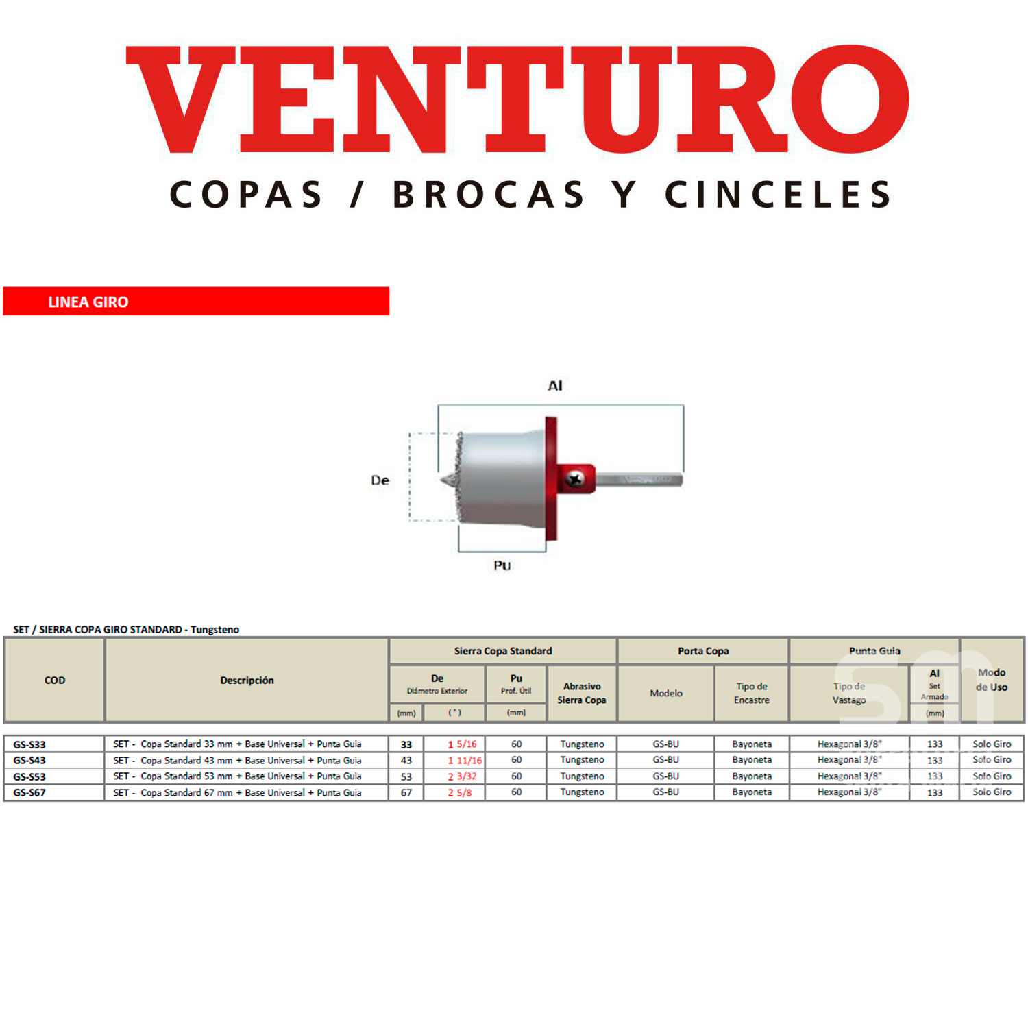 Contiene: 1 Punta guía + 1 Base Universal ( apta para Diámetros 33mm a 87mm) + Copa Carburo Tungsteno 67 mm Venturo Giro Standard