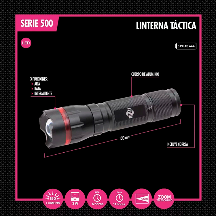 LINTERNA TACTICA 150 LUMENS BULIT SERIE 500 + 3 PILAS AAA