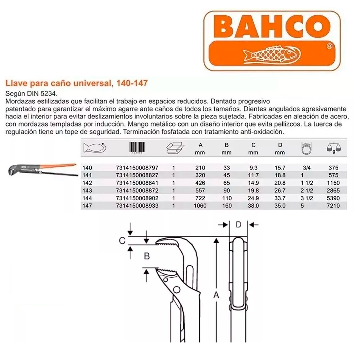 LLAVE P/ CAÑOS AJUSTABLE BAHCO 141 ACERO TEMPL APERTURA 45MM