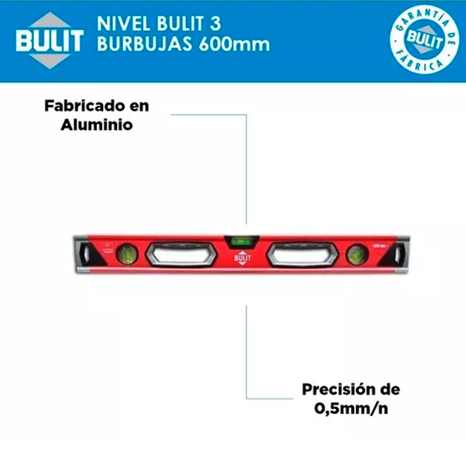 El Nivel Bulit 3 Burbujas 600mm Aluminio es el aliado perfecto para todos aquellos que buscan precisión y calidad en sus proyectos de construcción y bricolaje. Con su marca reconocida, Bulit, garantiza durabilidad y confiabilidad en cada uso. Este modelo en particular cuenta con tres burbujas, lo que permite una nivelación precisa en diferentes ángulos y direcciones. Su tamaño de 600mm lo convierte en una herramienta versátil, ideal para trabajos en espacios reducidos o de mayor envergadura. Además, su construcción en aluminio asegura ligereza y resistencia, facilitando su manipulación y transporte. No pierdas la oportunidad de adquirir este nivel de alta calidad y mejorar tus proyectos de construcción.