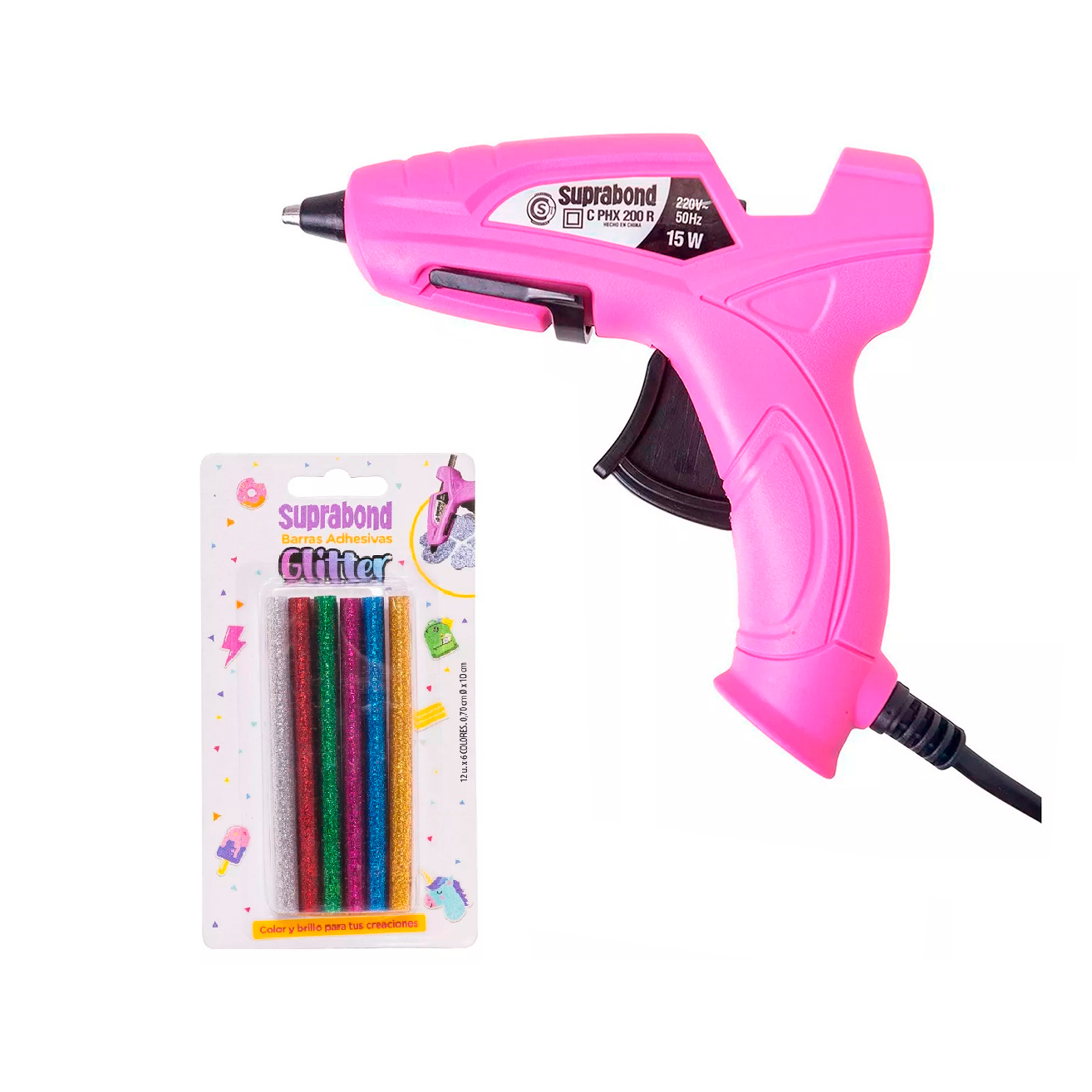 COMBO —> PISTOLA ENCOLADORA SUPRABOND HX 200 ROSA + PAQUETE C/ 12 BARRITAS DE SILICONA GLITTER SUPRABOND