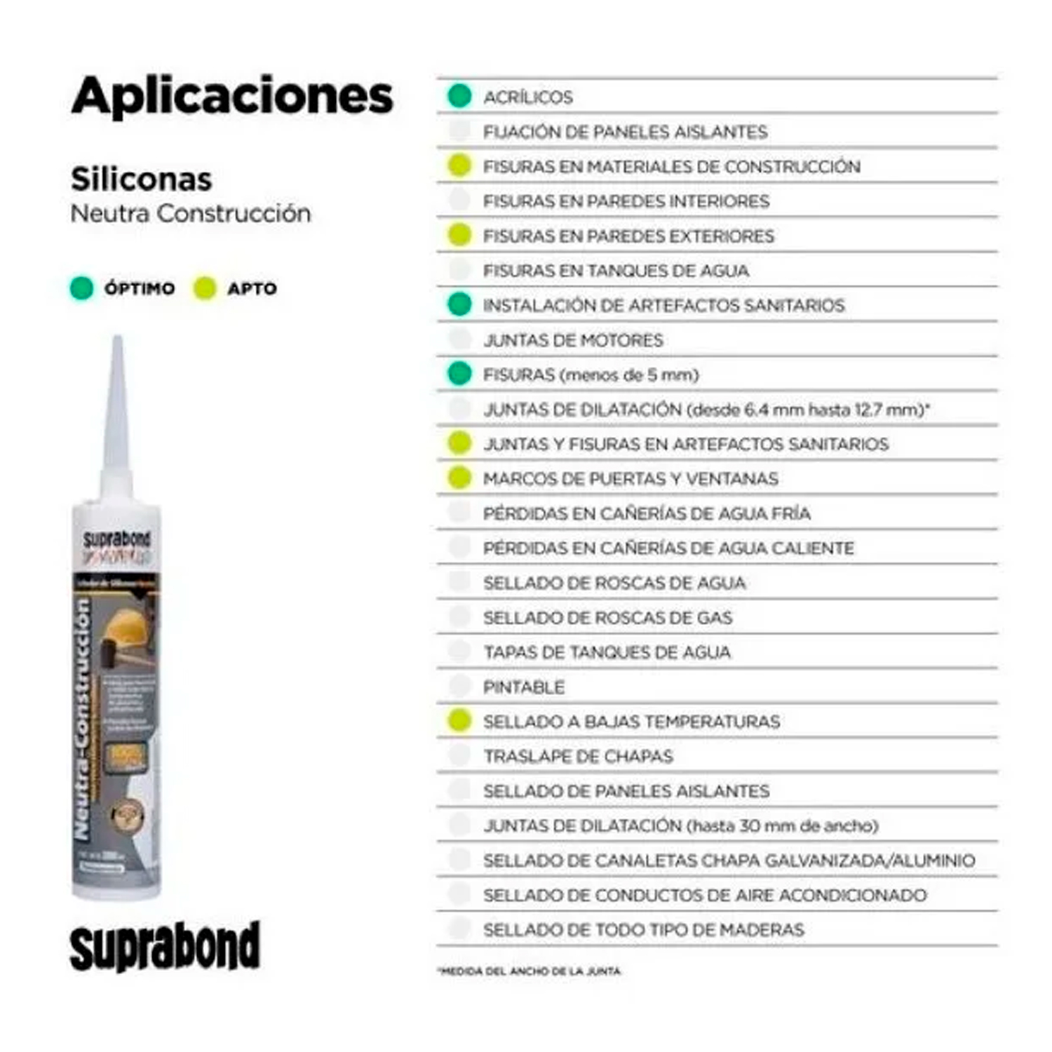 100% Silicona. Sellador de curado neutro con muy buena adherencia sobre materiales no porosos. Permite formar juntas de dilatación. Resistente al agua, a la humedad y a la intemperie. Absorbe vibraciones y golpes. Resiste altas y bajas temperaturas.