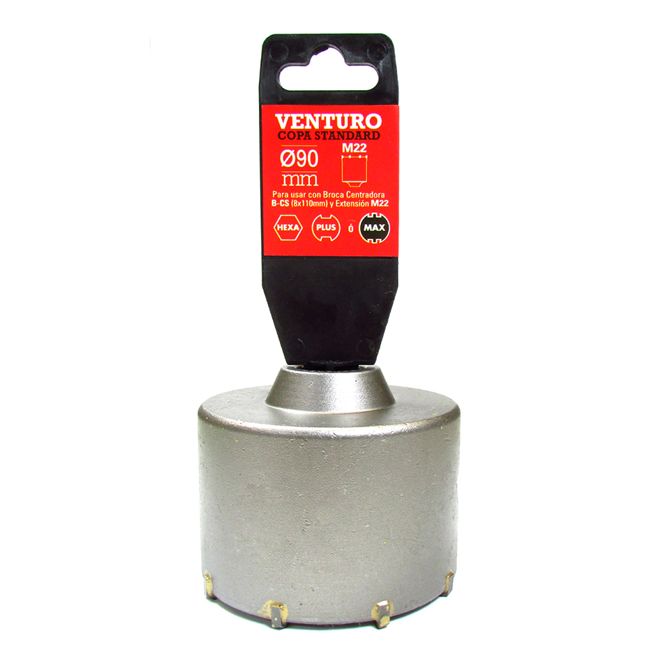 Copa con cuerpo de acero, insertos de widia, para ser utilizada en taladros rotopercutores y en martillos electroneumáticos encastre rápido tipo HEXA-PLUS-MAX. Su diseño permite realizar agujeros pasantes en materiales de espesores de hasta aproximadamente 40 cm. Para usar con Broca Centradora B-CS (8x110mm) y Extensión M22.